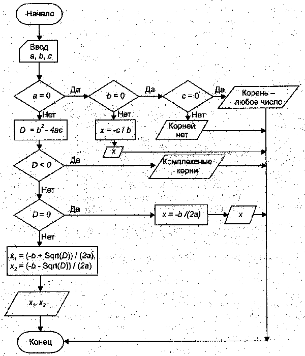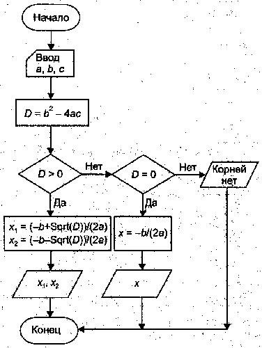 ) возникает аварийная ситуация (деление на ноль). Качественный алгоритм и качественная программа должны быть устойчивыми, то есть при любых входных параметрах завершение работы программы должно быть нормальным, хотя, возможно, и сопровождаться предупреждающим сообщением о некорректности входных данных. Свойством устойчивости обладает алгоритм решения квадратного уравнения, приведённый на рисунке: