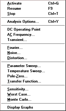 Меню Analysis позволяет выполнить различные анализы. Внешний вид меню приведен на рисунке 2.5. Перед выполнением каждого из них пользователю будет предложено заполнить параметров анализа. Анализ будет выполнен только в том случае когда это возможно для данной схемы.