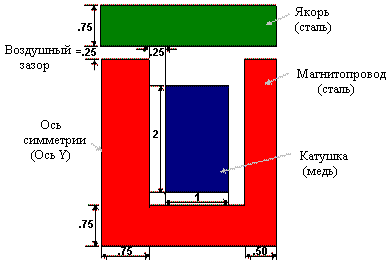 Электромагнитный привод анализируется как осесимметричная двухмерная (2-D) модель. Для заданного тока в обмотке вычисляется сила, возникающая на якоре.