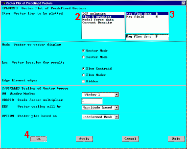 1. Main Menu > General Postproc > Plot Results > Vector Plot> Predefined