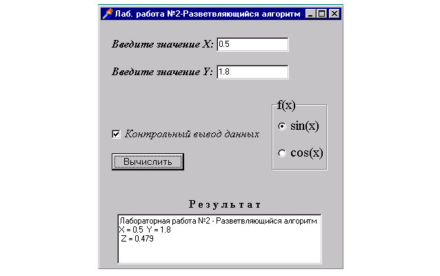 Memo1.Lines.Add(‘Лабораторная работа №2 - Разветвляющийся алгоритм’);