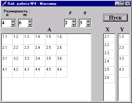 Задание: создать Windows-приложение для вычисления вектора x={x1,x2,…,xm},равного p-й строке матрицы A={aij}(xj=apj, j=1,2,…,m) и вектора y={y1,y2,…,yn}, равного q-му столбцу матрицы A={aij}(yi=aiq, i=1,2,…,n) (n6,m8). В панели интерфейса предусмотреть возможность управления размерностью массивов.