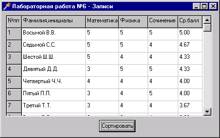Задание: создать Windows-приложение для обработки ведомости об успеваемости учащихся в количестве 9 человек. Каждая запись должна содержать фамилию, инициалы, а также оценки по физике, математике и сочинению. Вывести список учащихся, отсортированный в порядке уменьшения их среднего балла.