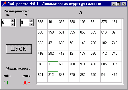 Задание: создать приложение для вычисления наименьшего и наибольшего из всех значений элементов целочисленной матрицы A={aij}, где i=1,2,…, m; j=1,2,…, n. Значения m и n задаются пользователем на панели интерфейса, а элементы матрицы A генерируются с помощью датчика случайных чисел и размещаются в памяти динамически.