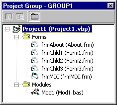 Файлы для каждой формы приложения (frmMDI.frm, Form1.frm, Form2.frm, Form3.frm, About.frm,), содержащие текстовые описания форм и их элементов управления, включая установки их свойств, а также локальные объявления (уровня формы) констант, переменных и внешних процедур, процедуры обработки событий и главные процедуры;