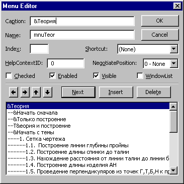 Обычно эта форма содержит горизонтальное меню, которое служит для управления дочерними формами и строку состояния, которая отображает текущее состояние приложения. С помощью редактора Menu Editor (команда Menu Editor в меню Tools), было создано горизонтальное меню приложения.