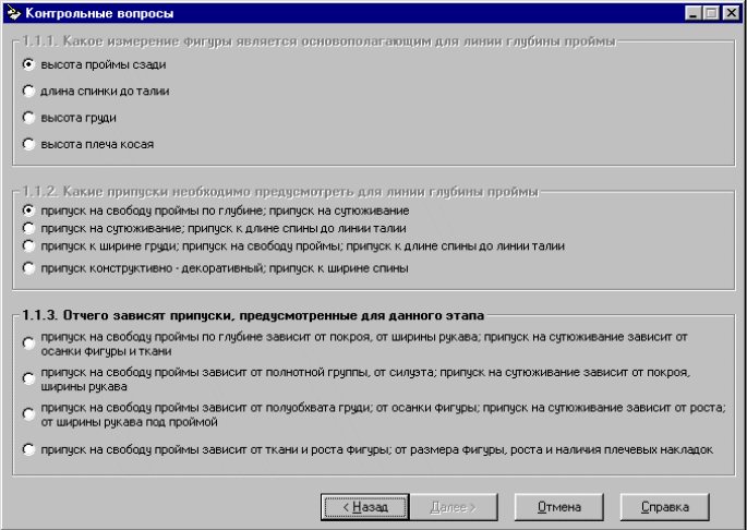 Диалоговое окно, содержащее контрольные вопросы, активизируется после прочтения теоретического материала пользователем по нажатию кнопки «Далее», если предварительно был выбран пункт меню «Начать сначала» или «Начать с темы». Последующие действия аналогичны для этих пунктов меню, различие только составляют темы, с которых начинает студент.