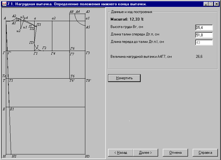 В приложении предусмотрено непосредственно моделирование процесса построения; варьируя значение нужной величины и наблюдая как это изменение отражается на чертеже основы изделия.
