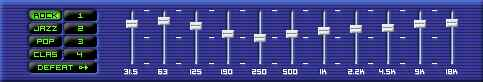 Ниже панели управления располагается 11-ти полосный эквалайзер(рис.24), имеющий еще и несколько фиксированных положений: Rock, Jazz, Pop, Clas.
