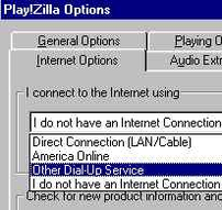 Есть два варианта поиска: в Интернете и Hard Drive (так названы все ваши винчестеры и дисководы вместе взятые). Если вы решите искать в Интернете, то предварительно необходимо произвести небольшую настройку: нажмите Ctrl+O, откроется панель Play!Zilla Option. Выбирайте закладку Internet Option, а в ней из выкидного списка "In connect to the Internet using" выберите "Other Dial-Up Service". И можете начинать искать.