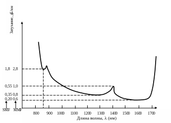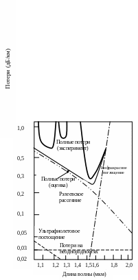 Длина волны, на которой достигается нижний предел собственного затухания чистого кварцевого волокна, составляет 1550 нм и определяется разумным компромиссом между потерями вследствие рэлеевского рассеяния и инфракрасного поглощения.