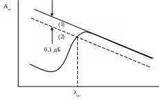 Многомодовое волокно является эталонным. При этом один и тот же источник излучения с перестраиваемой длиной волны используется как для одномодового, так и для многомодового волокна. Строится кривая Am(λ), рис (4.1), длинноволновый участок которой экстраполируется кривой (1). Строится параллельная прямая (2), отстоящая ниже (1) на 0,1 дБ. Точка пересечения прямой (2) с кривой Am(λ) соответствует длине волны отсечки.
