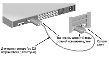 Для гарантированной доставки кадров Fast Ethernet необходимо использовать полнодуплексное соединение (см. стр. 41). Как было сказано выше, в рабочих группах цехов допустимо использование концентраторов. Компания Hewlett-Packard предлагает недорогую замену коммутатора рабочей группы (в нашем случае без него можно обойтись, практически не уменьшая пропускной способности сети) концентратором HP AdvanceStack 100Base-T Hub-12TX с одним коммутируемым слотом для модулей 100Base-TX и 100Base-FX. Данный концентратор также имеет 12 RJ-45 портов (Рис. ХХХ).