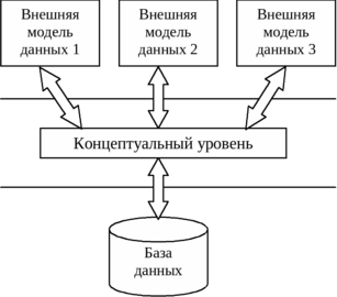 В процессе научных исследований, посвященных тому, как именно должна быть устроена СУБД, предлагались различные способы реализации. Самым жизнеспособным из них оказалась предложенная американским комитетом по стандартизации ANSI (American National Standards Institute) трехуровневая система организации БД, изображенная на рис. 2.1: