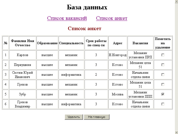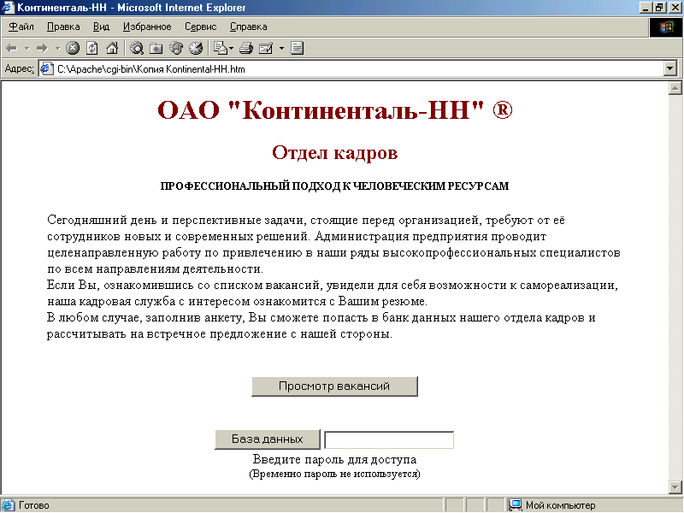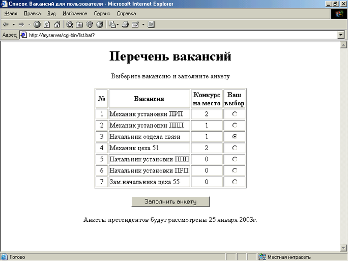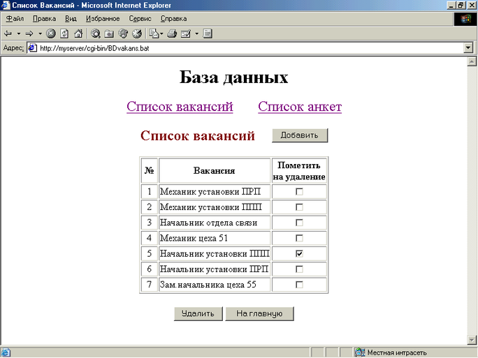 “Список вакансий" - запускает скрипт BDvakans.cgi;
