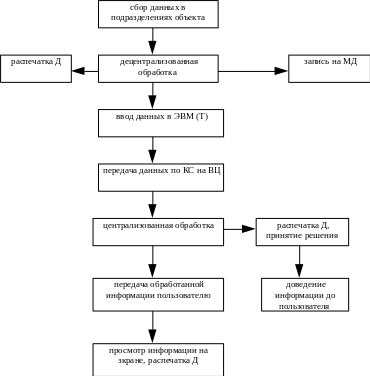 | 1. Сбор данных в подразделениях 2. Формирование документа (регистрация И) 3. Децентрализованная обработка данных 4. Распечатка Д 5. Формирование машинного носителя (МД) 6. Передача Д, МД на ВЦ 7. Ввод данных в ЭВМ 8. Передача информации по КС на ВЦ 9. Централизованная обработка данных 10. Либо на 14 Вывод результатов в виде Д 11. Запись результатов на МД 12. Размножение Д, МД 13. Передача Д, МД пользователю 14. Передача результатов по КС в подразделения 15. Просмотр информации на экране 16. Распечатка Д в подразделениях | человек человек, КЛ ЭВМ IBM PC/AT АЦПУ УПД на МД курьер IBM OC/AT (АП) АП-АПД-КС-АПД-МПД IBM PC/AT 486 DX2 АЦПУ УПД на МД СANON PC-1, УПД на МД курьер ВЦ-МПД-АПД-КС-АПД-АП(IBM) IBM PC/AT АЦПУ | визуальный визуальный, контр.сумм контр. сумм, ариф. методы визуальный чет, нечетн ¾ визуальный, чет,нечет чет, нечет,контр.разроа чет, нечет визуальный, ариф. операций ариф. операций логический ¾ чет, нечет чет, нечет визуальный | Д Д, маш. коды маш. коды Д МД Д.МД маш. коды маш. коды маш. коды Д МД Д,МД Д,МД маш. коды маш. коды Д |
