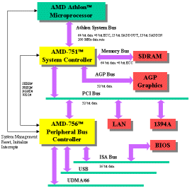 Сам чипсет AMD 750 не представляет собой ничего особенного - по возможностям он аналогичен i440BX. Но большего, в принципе, и не надо. AMD Athlon, как мы видели, и так работает нормально и даже обгоняет по производительности конкурирующие продукты.