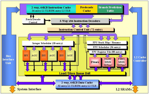 Перед тем, как попасть в соответствующий вычислительный блок, поступающий поток RISC-команд задерживается в небольшом буфере (Instruction Control Unit), который, что уже неудивительно, у AMD Athlon расчитан на 72 инструкции против 20 у Pentium III. Увеличивая этот буфер, AMD попыталась добиться того, чтобы дешифратор команд не простаивал из-за переполнения Instruction Control Unit.