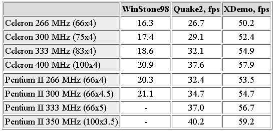 Теперь собственно о том, что такой разгон дает. Нами были протестированы процессор Celeron и Pentium II, чтобы выявить, насколько плох первый по сравнению со вторым. Тестирование проводилось на базе материнской платы Abit BX6 на чипсете 440BX, позволяющей установку внешней частоты 66, 75, 83, 112 и 133 МГц. Остальные комплектующие - SDRAM Hyundai 2х32 Мбайта с SPD, жесткий диск Quantum Fireball SE 2.1 Гбайта, видео Diamond Viper V330 AGP. На компьютере установливалась операционная система Windows 95 OSR 2.1, DX 5.0 и все необходимые драйвера - видео (бета 1.44 с поддержкой OpenGL) и Bus Mastering. В качестве тестов применялся WinStone98 для измерения скорости работы офисных приложений, Quake2 для измерения скорости работы OpenGL-игр и Xdemo для оценки скорости работы DirectX-игр.