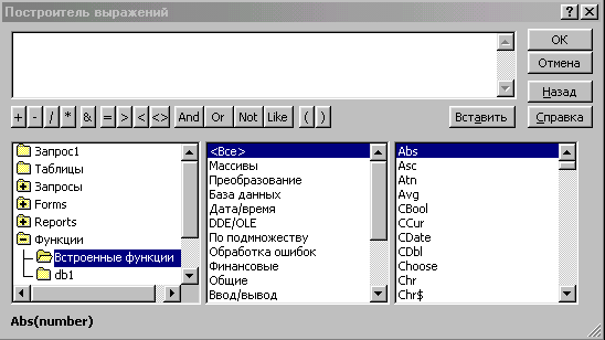 В верхній частині цього вікна міститься пуста область введення, яка призначена для створення виразів. Можна самому ввести вираз, але легше використати різні кнопки операторів, які містяться прямо під областю введення. В нижній частині вікна знаходяться три списки, призначені для пошуку імен імен полів і функцій, необхідних для створення виразів.