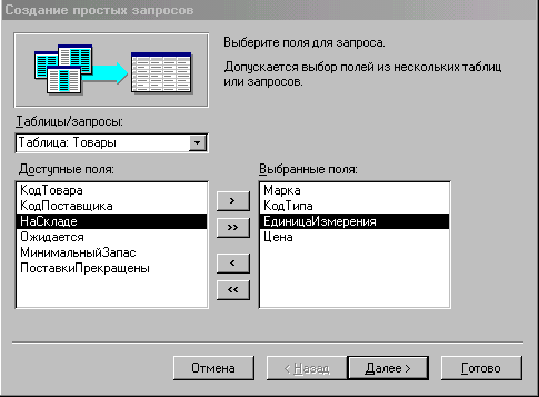 Якщо необхідно, вказати додаткові таблиці або запит, а потім вибрати з них поля, які повинні бути використані.