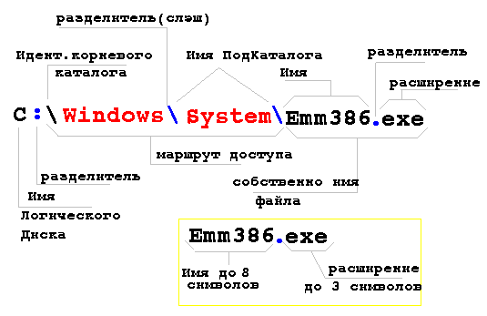 “Имя логического диска”+”двоеточие”+”идентиф.корневого каталога” +”весь перечень имен родительских каталогов” = маршрут доступа к файлу(каталогу). Максимальное кол-во символов в ПОЛНОМ имени файла = 78, Максимальное кол-во символов в имени файла = 8,