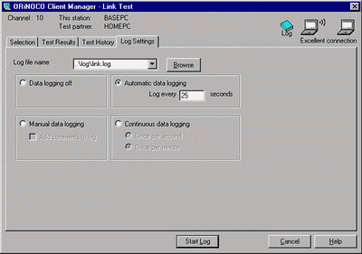 Сначала можно выбрать партнера для теста из доступных станций. На закладке "Test Results" можно посмотреть текущие характеристики канала связи, причем параметры оцениваются с обеих сторон канала. Там же можно посмотреть, на каких скоростях происходит обмен информацией. Закладка "Test History" показывает динамику изменения параметров связи. С помощью закладки "Log Settings" можно настроить запись характеристик канала в файл.