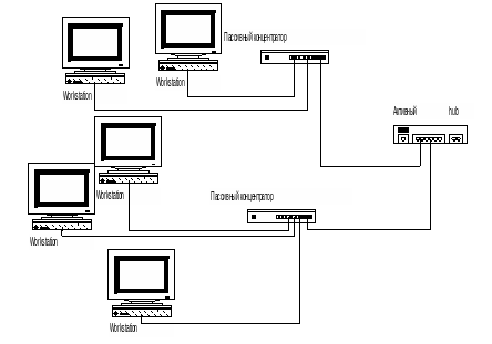 широковещательную звездообразная сеть, предусматривающую использование центрального узла как безбуферного повторителя, который направляет все приходящие сигналы во все исходящие из него линии.