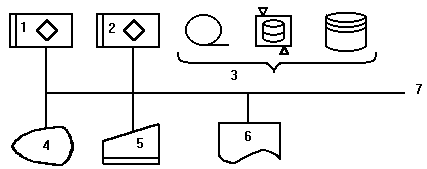 1-микропроцессор, 2-основная память, 3-ВЗУ, 4-дисплей, 5-клавиатура, 6-печатающее устройство, 7-системная магистраль.