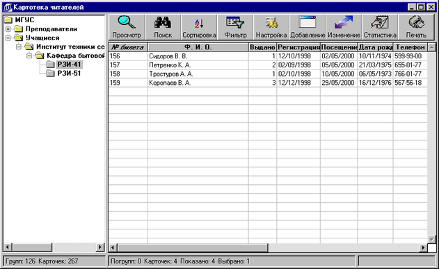 На рисунке 4.23 представлена главная форма для работы с картотекой читателей. Слева располагается дерево групп, в котором отображаются групп читателей. Справа находится таблица, содержащая список читателей для выбранной группы, в ней отображаются следующие данные: