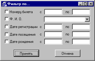 Фильтрация может производиться по любой совокупности выбранных параметров. Отмеченные, но не заполненные параметры при установке фильтра не учитываются. Выбранные параметры хранятся как массив главной формы картотеки читателей, а установка фильтра производиться командой SET FILTER TO [список параметров].