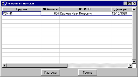 Для параметров “Название группы”, “Фамилия”, “Имя” и “Отчество” возможен выбор значения из списка формируемого на основе таблиц Issue, Name1, Name2 и Name3 соответственно. В форме просмотра результатов поиска, показанной на рисунке, первыми отображаются данные наиболее соответствующие введённым значениям, те которые удовлетворяют логическому условию И, затем все которые удовлетворяют логическому условию ИЛИ.