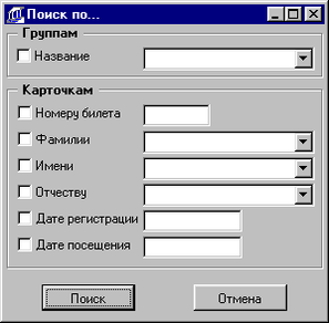 На рисунке 4.26 показана форма для ввода параметров поиска. Поиск может осуществляться по группам и по карточкам читателей, для этого необходимо определить хотя бы один из следующих параметров: