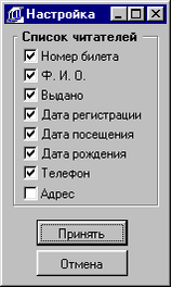 Так же форма предоставляет возможность просмотра текущих установок. После выбора параметра для сортировки в списке читателей, он отображается в заголовке соответствующего столбца таблицы изменением шрифта надписи на курсив.