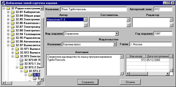 Для ввода автора (списка авторов), составителя (списка составителей), редактора (списка редакторов) и издательства используются списки полученные на основе таблиц Creators и Publisher соответственно.