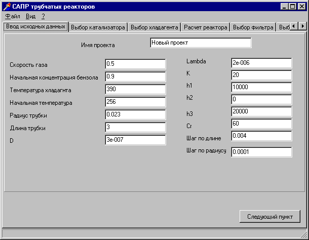 При вводе проверяется тип вводимых данных. Часть пунктов в бланках заполняются автоматически на основании уже введенной информации пользователем. Это перечень введенных параметров, приемлемые значения габаритных размеров проектируемой модели реактора и точности.