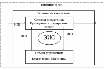 Структура экономической системы (промышленного предприятия, торговой организации, коммерческого банка, государственного учреждения и т.д.) представлена на рис. 1.3, где основные информационные потоки между внешней средой, объектом и системой управления помечены метками над стрелками ИП1, ИП2, ИПЗ, ИП4 и связаны с поддерживающей их экономической информационной системой (ЭИС).