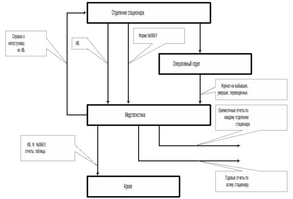 В медстатистику поступают истории болезни (ИБ) с заполненными врачами статистическими картами на выбывших из стационара (форма №066/у). Форма №066/у заполняется на каждого выбывшего. На каждого иногороднего выбывшего заполняется дополнительно еще одна форма №066/у. В подразделении медстатистики производится сверка поступивших ИБ на выбывших с данными журнала на выбывших, умерших и переведенных (ЖВ). В ЖВ вносятся отметки о наличии ИБ на выбывших. Далее составляется справка о непоступивших ИБ на выбывших больных, которая передается обратно в отделения. Поступившие ИБ отправляются в архив на хранение. Формы №066/у складываются в папки отделений для составления отчетов о деятельности стационара. Второй экземпляр формы №066/у на иногородних больных отправляется в Боткинскую больницу для дальнейшей статобработки. Далее, на основании формы №066/у в подразделении медстатистики готовятся следующие отчетные формы для отделений стационара, бухгалтерии и администрации больницы: