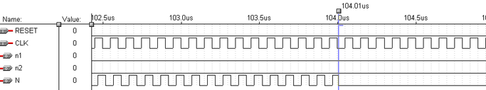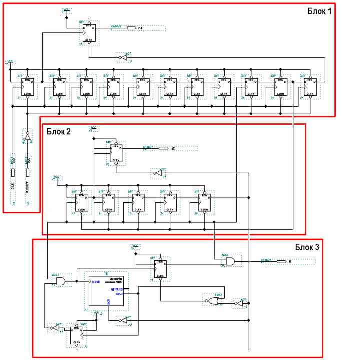 Сигнал «сброс» для второго блока (Блок2) берется с выхода Q предпоследнего триггера линии задержки блока (Блок1) (для совпадения среза сигнала с первого блока (Блок1), и фронта, сигнала со второго блока (Блок2)). Сигнал «n2» формируется с 6 (шестого) триггера Блока (Блок2) аналогично формированию сигнала «n1». Линия задержки сформирована на четырех D – триггерах.