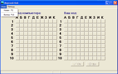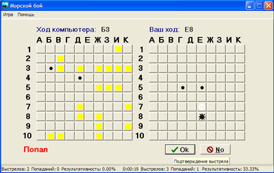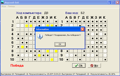 Игроку предоставляется право первого хода. Ход осуществляется путем щелчка левой кнопкой мыши на игровом поле. После щелчка по клетке поля на ней появляется изображение мины (рис.4), и игроку предоставляется право подтвердить или отменить ход с помощью кнопок OK и No. После подтверждения в ячейке появляется изображение результата хода, а в нижней левой части окна появляется сообщение о результате: «Попал» (рис.4) или «Промах!». Если был произведен результативный выстрел, то игроку дается право внеочередного хода. В противном случае право хода передается компьютеру. Победа присуждается за все потопленные корабли, и на этом игра заканчивается (рис.5).
