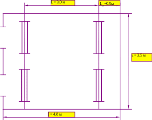 Располагаем светильники вдоль стороны помещения с окном. Расстояние между стенами и крайним рядом светильников считаем по формуле: