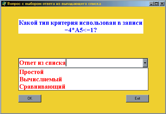 На четвертом этапе нужно создать проект для вопроса с выбором ответа из выпадающего списка (Project4, Unit4.pas, Form4). Пример такой формы приведен на рис.3.