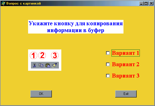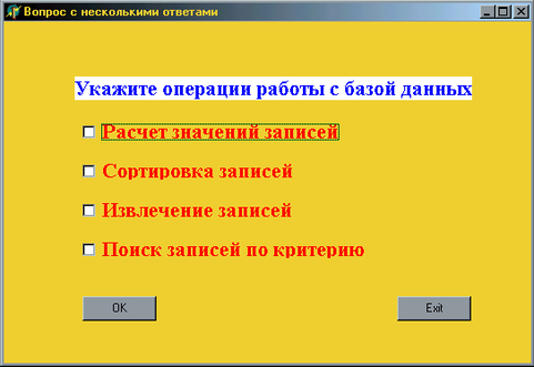 При выделении правильных ответов, и нажатии кнопки OK, происходит обработка ответа (Приложение 2). Если, при проверки условия, происходит совпадение (рис.15, блок2), то приложение завершает свою работу (блок 3). Кнопка Exit позволяет не отвечать на вопрос, и прервать выполнение этого приложения, т.е. она работает аналогично кнопкам Exit, описанным выше.