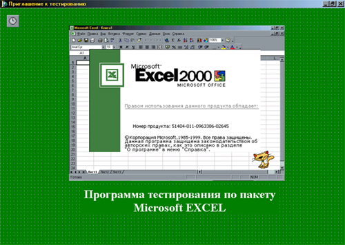 На первом этапе создается заставка, содержащая название тестирующей программы. В качестве примера производится тестирование на знание программы Microsoft Excel из пакета программ Microsoft Office 2000.