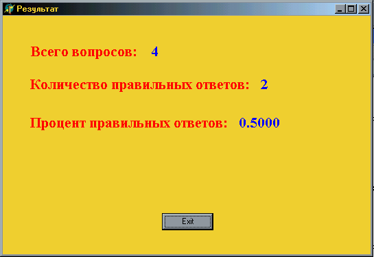 Далее, пройденный вопрос считается, с рабочего стола исчезает форма 2 и выводится форма 4 (блок 7). В случае нажатия кнопки Exit активизируется процедура Button2Click (Приложение 4, рис.26), которая завершает работу данного приложения.