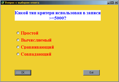 На пятом этапе необходимо создать проект для вопроса с выбором одного ответа (Project5, Unit5.pas, Form5). Пример такого проекта приведен на рис.4.
