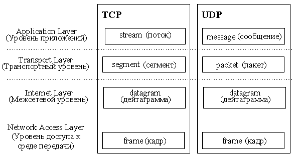 Стек протоколов TCP/IP делится на 4 уровня: прикладной (application), транспортный (transport), межсетевой (internet) и уровень доступа к среде передачи (network access). Термины, применяемые для обозначения блока передаваемых данных, различны при использовании разных протоколов транспортного уровня - TCP и UDP, поэтому на рисунке 6 изображено два стека. Как и в модели OSI, данные более верхних уровней инкапсулируются в пакеты нижних уровней (см. рис. 5).