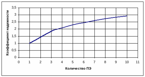 Анализ кривых показывает, что среднее время безотказной работы увеличивается в 2-3 раза по сравнению со средним временем безотказной работы одного ПЭ при наращивании вычислительных ресурсов в 5-7 раз и далее стабилизируется и возрастает незначительно. Вероятность отказа систем с рангом отказоустойчивости N(N-1) резко уменьшается при рассмотрении ВС типа 5(4) – 7(6) и далее ее снижение незначительно.