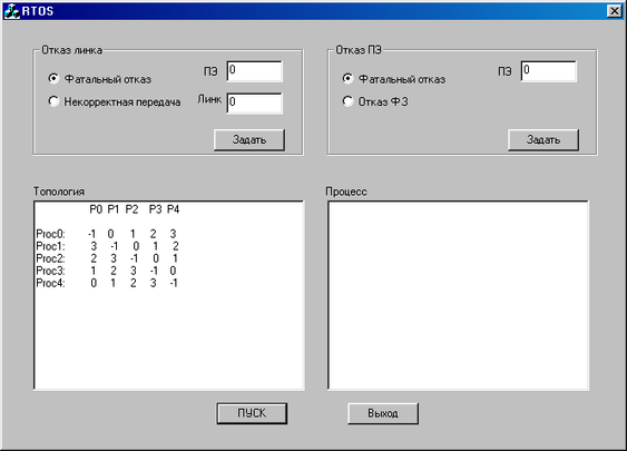 | Поле вывода (Rich Edit) «Топология» | Обеспечивает отображение текущей топологической информации в виде модифицированной матрицы связности (текстовый вид), обновляющейся на каждом такте работы ВС. |