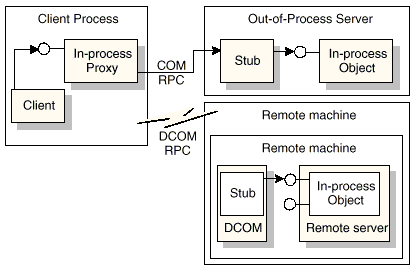 Разница между внутренним и удаленным серверами в том, какой тип межпроцессной связи используется. В данном случае существует необходимость использования посредников, которые обеспечивают передачу параметров и вызов функций. Такой механизм называется маршаллингом (marshalling). Т.к. в случае, когда клиент и сервер находятся в разных адресных пространствах, доступ к ресурсам не может быть осуществлен непосредственно через указатели. Поэтому посредники со стороны клиента (proxy) осуществляют упаковку аргументов в пакеты маршаллинга (marshalling packets), и обеспечивают удаленный вызов процедур (Remote Procedure Call). Посредник со стороны сервера (stub) реализуют распаковку параметров, и помещение их в стек. Далее осуществляется вызов непосредственно реализации метода. По сути, сервер создает клиентский вызов процедуры в своем собственном адресном пространстве.